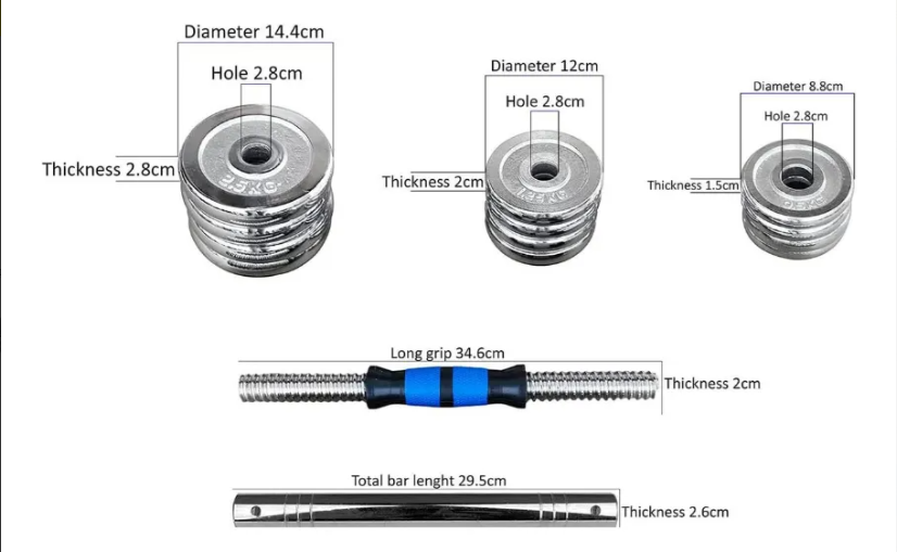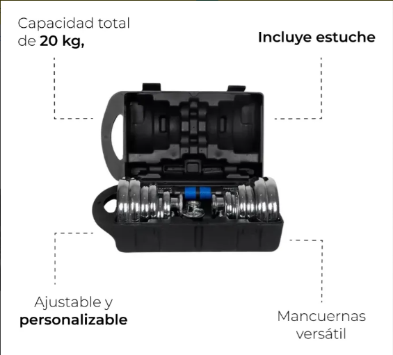 Este kit de mancuernas con barra y discos es perfecto para entrenar brazos, hombros, pecho, espalda y más. Su diseño versátil permite usarlo como mancuernas individuales o barra larga, brindándote un entrenamiento completo en un solo equipo.